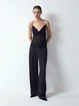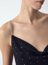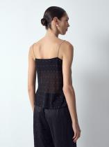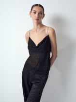 Полупрозрачный топ из лёгкого и мягкого шифона в чёрном цвете украшен рядами некрупных страз с деликатным звёздным сиянием. Они не перегружают образ, но делают его интереснее. Тонкие акцентные бретели также украшены стразами, немного более крупными. Топ легко и красиво садится, элегантно смотрится за счёт лаконичного фасона без лишних деталей. Модель маломерит на один размер. Выполнена без подкладки.