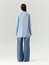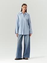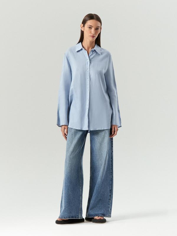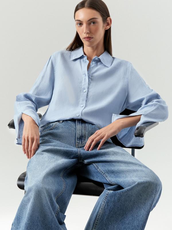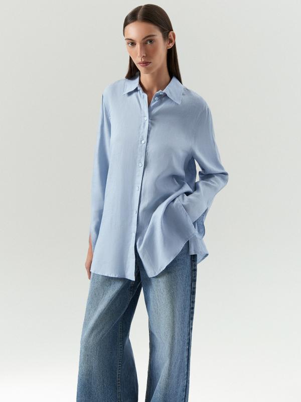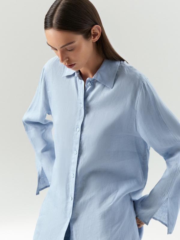 Рубашка небесно-голубого цвета из приятного к телу льна и хлопка стилизована оригинальными свободными рукавами клеш удлиненной модели. Она застегивается на пуговицы и имеет свободный силуэт, который не сковывает движений, добавляя легкости и оригинальности вашему образу. Эту рубашку легко дополнить брюками или денимом для создания стильного и комфортного наряда.
