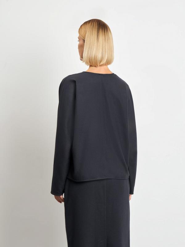 Оригинальная блузка серого цвета. Выполнена из костюмного материала с высоким содержанием вискозы. Блузку отличают длинный рукав формата "