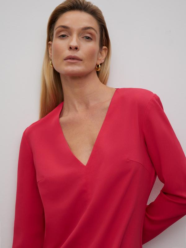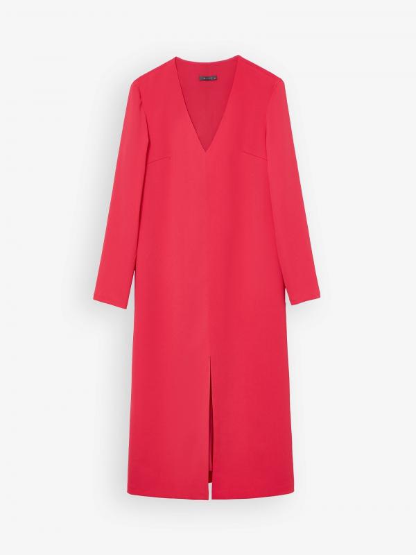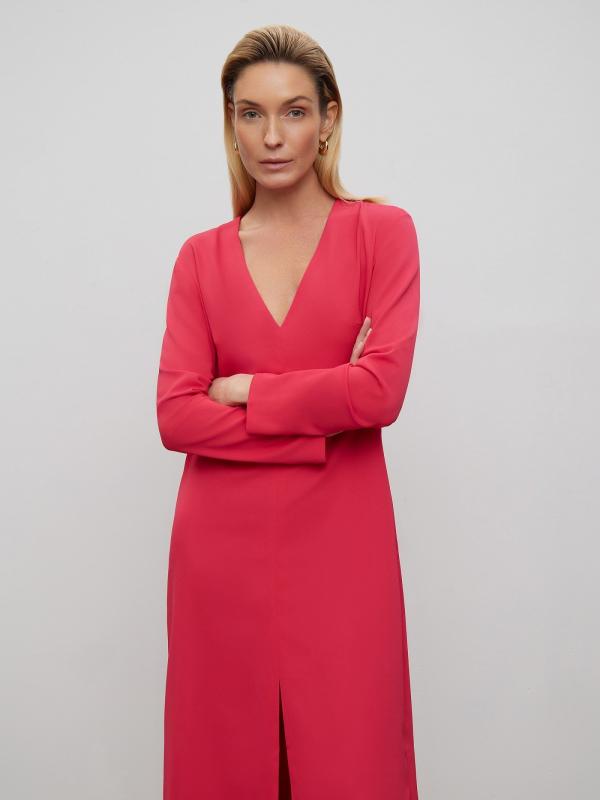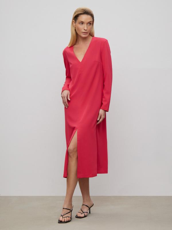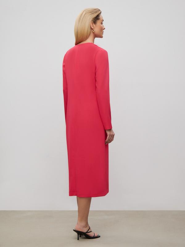 Универсальное платье цвета фуксии станет основой повседневного гардероба, а с праздничными аксессуарами легко превратится в отличный вариант для особого случая. Модель прямого кроя в длине миди имеет V-образный вырез и длинный рукав. Изделие застёгивается сзади на молнию. Выполнено из материала с содержанием вискозы, на подкладке.