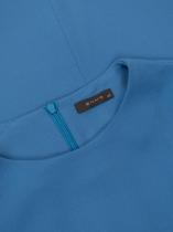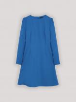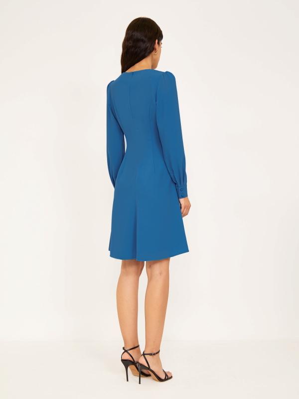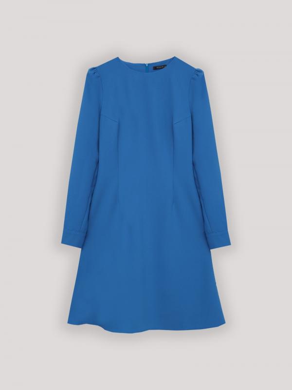 Платье креповой фактуры в ярком синем цвете. Модели придают особый шарм длинные втачные рукава с мягкой сборкой у плеч. Рукава изящно завершают элегантные манжеты с защипами. Манжеты застёгиваются на пуговицы в тон. Элегантные вытачки платья подчёркивают красоту фигуры. Приталенная модель выше колена имеет круглый вырез под горло. Платье подходит как для офисных и повседневных образов, так и на особый случай. Выполнено из материала с высоким содержанием вискозы, без подкладки. Застёгивается на молнию сзади.