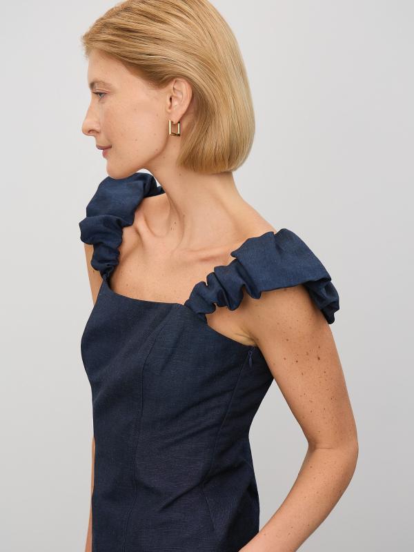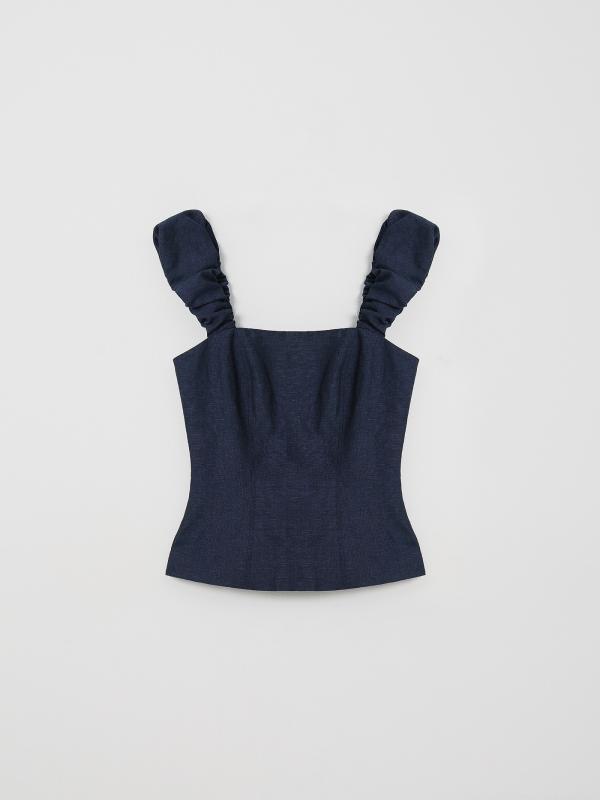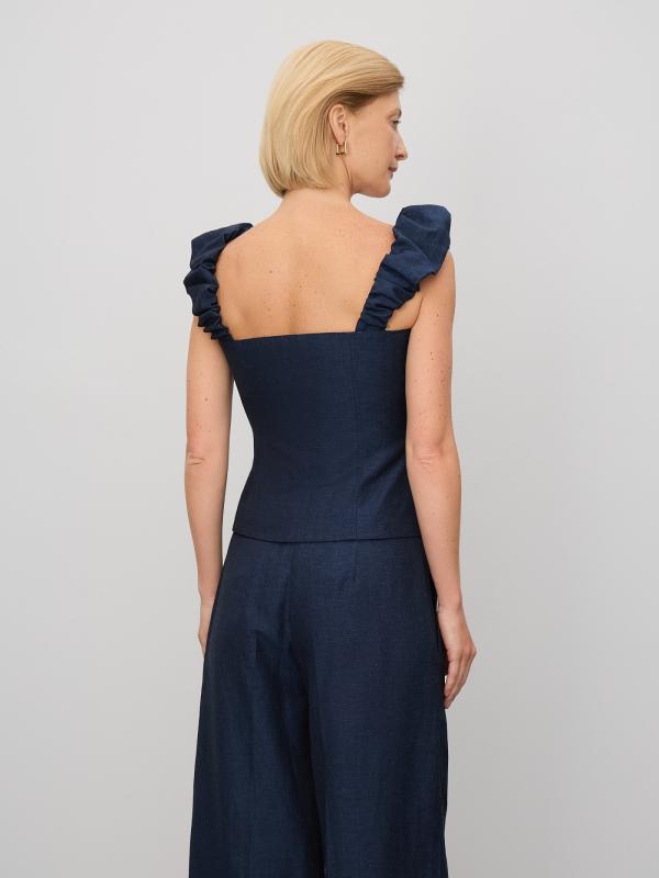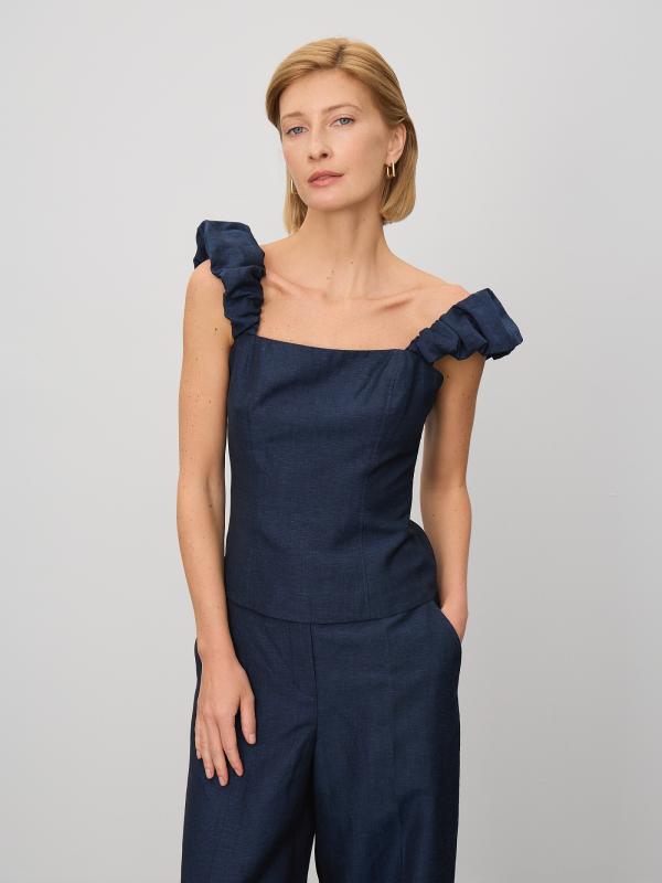 Модный корсетный топ на объемных бретелях со сборкой. Фактурный материал тёмно-синего цвета напоминает деним, но выполнен из льна и хлопка в равных пропорциях. Приталенная модель с открытой спиной подчеркивает красоту фигуры. С топом можно составить множество модных летних образов, сочетая его с брюками из комплекта, джинсами или джинсовой юбкой в тон, а также другими вариантами низа. Изделие выполнено на комфортной к телу подкладке из хлопка.