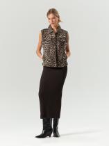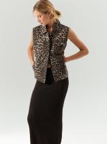 Модный джинсовый жилет с отложным воротником украшает главный принт сезона — леопардовый. Плотный и качественный деним полностью состоит из хлопка. Жилет отлично дополнят брюки или юбка из комплекта.