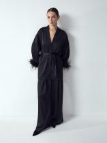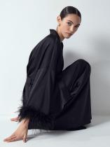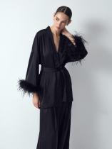 Чёрная блуза-пеньюар с поясом дополнена съемными перьями на рукавах. Они создают настроение праздника и радуют нежными прикосновениями к коже. Декор крепится на пуговицах с потайными шлевками: есть снять перья, места крепления абсолютно незаметны. Ткань с содержанием вискозы красиво струится. В комплекте с брюками и топом из комплекта получится шикарный монохромный образ, который не останется незамеченным.