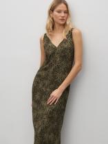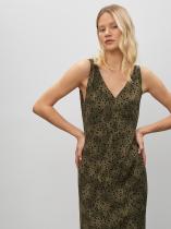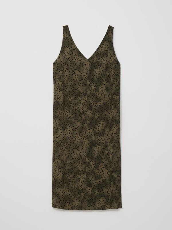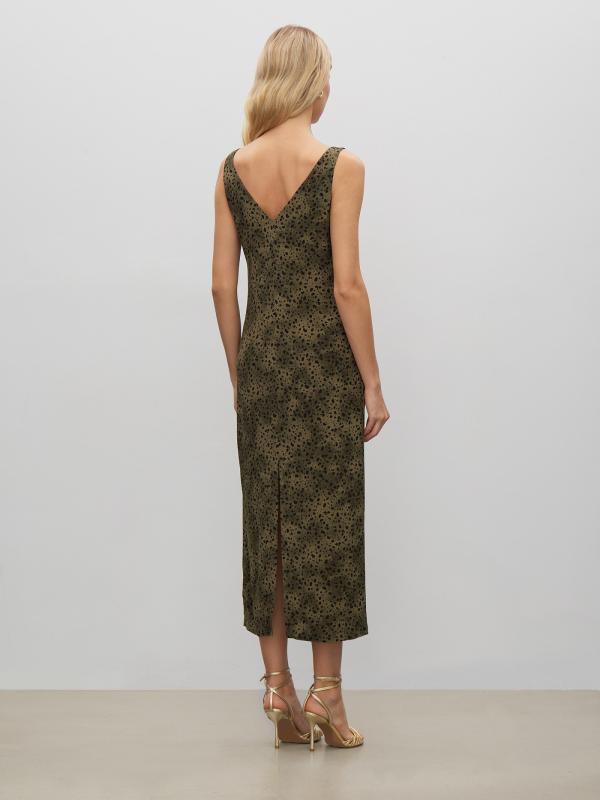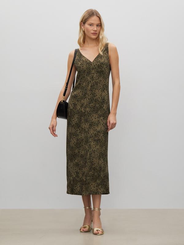 Элегантный летний сарафан цвета хаки с принтом. Комфортен к телу, выполнен из вискозы, без подкладки. Стильные V-образные вырезы спереди и сзади делают образ по-настоящему летним. Лаконичный прямой силуэт вносит лёгкость. Сзади предусмотрен разрез для свободы движения. Сарафан идеален для атмосферных прогулок по набережной. Его также можно надеть в офис под деловой жакет, дополнив изящным поясом.