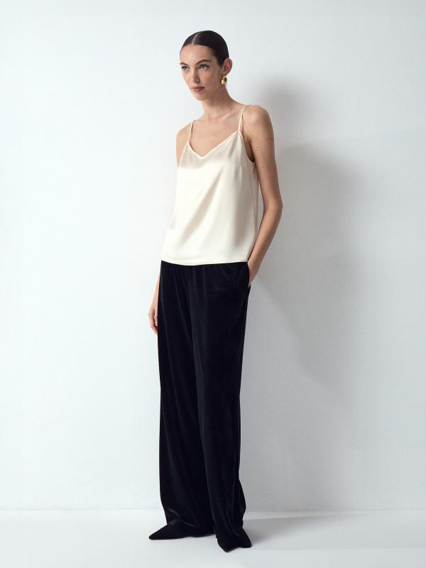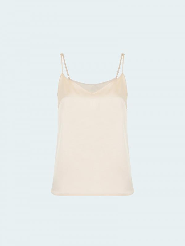 Обаятельный в своей лаконичности топ подойдёт и к празднику, и на каждый день. Атлас нежного сливочного оттенка делает образ элегантным. Лаконичная модель имеет V-образный вырез и регулируемые бретели. Топ безупречно сочетается с костюмами разных фактур, акцентными и базовыми брюками, юбками и джинсами.