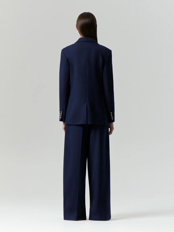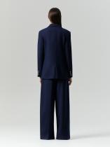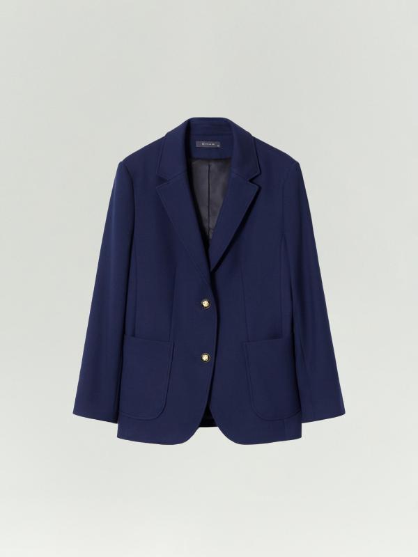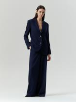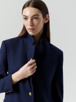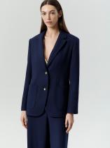Жакет с акцентной фурнитурой в насыщенном тёмно-синем цвете сочетает сдержанность офисного стиля и расслабленность. Материал с содержанием вискозы на ощупь напоминает плотный трикотаж. Модель полуприталенного кроя дополнена английским воротником и крупными накладными карманами. Пуговицы с изящной золотистой чеканкой станут изюминкой образа. Дополнить образ можно брюками из комплекта. Изделие изготовлено на подкладке.
