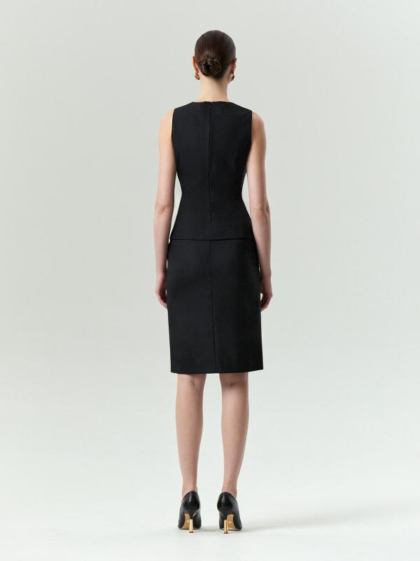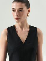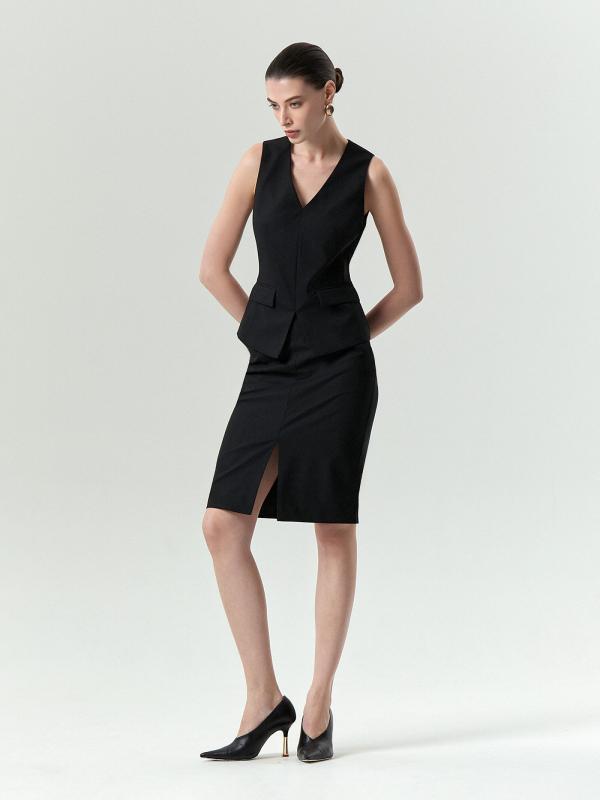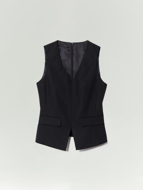 Приталенный жилет создаёт стильный и современный образ на каждый день. V-вырез поддерживается остроугольным разрезом внизу, прямоугольные клапаны дополняют интересную геометрию вещи. Модель стройнит, изящно смотрится на фигуре. Тонкий, но тёплый костюмный материал на четверть состоит из шерсти, выполнен с содержанием вискозы и добавлением эластана. Это идеальный вариант на демисезон и не только. Жилет застёгивается сзади на удобную молнию. Выполнен на подкладке с высоким содержанием вискозы. Завершить образ с ним можно брюками из комплекта.