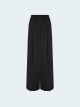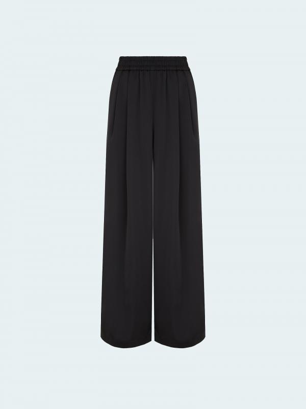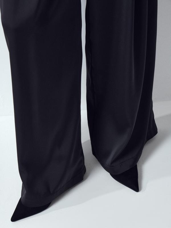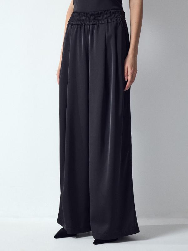 Брюки палаццо чёрного цвета сделают образ роскошнее. Стильная высокая посадка на широкой резинке обеспечит комфорт. Брюки изготовлены из струящегося материала с содержанием вискозы, без подкладки. Дополнить можно стильной блузкой из комплекта.