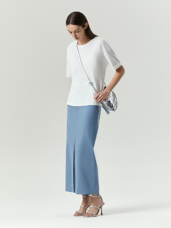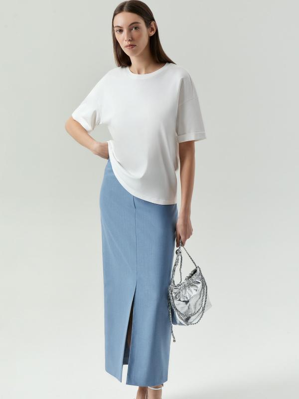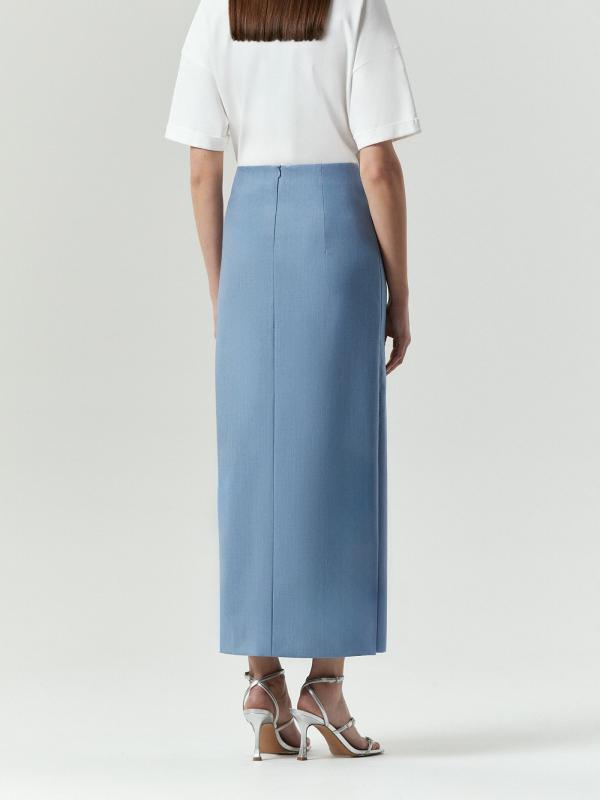 Юбка-карандаш в разбелённом голубом цвете — must have сезона. Цвет сейчас на пике моды, создаёт женственный и лёгкий образ, при этом допустим в деловом дресс-коде и легко вписывается в базовый гардероб. Тонкий, но тёплый материал с содержанием шерсти отлично подойдёт на демисезон. Базовая модель имеет высокую посадку и длину мидакси. Дополнена глубоким разрезом: удобно в движении и поддерживает тренды сезона. Застёгивается на молнию сзади. Изготовлена на подкладке. Юбка может стать основой капсулы с брюками и платьем nikolo.