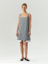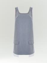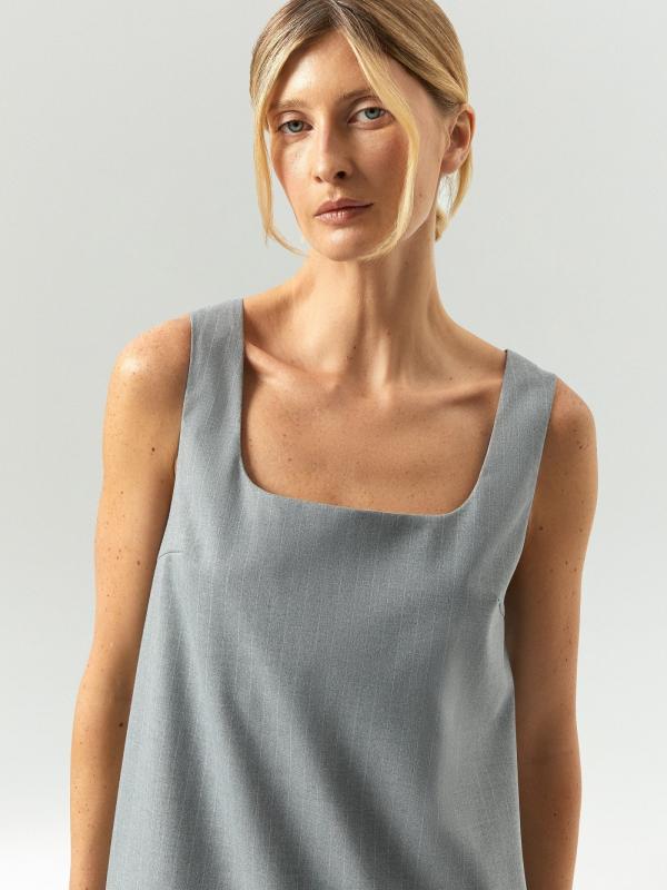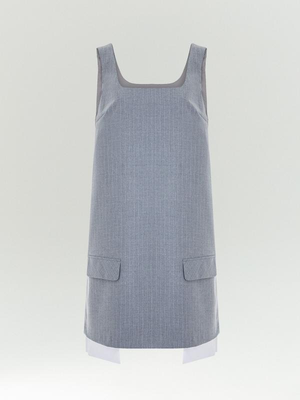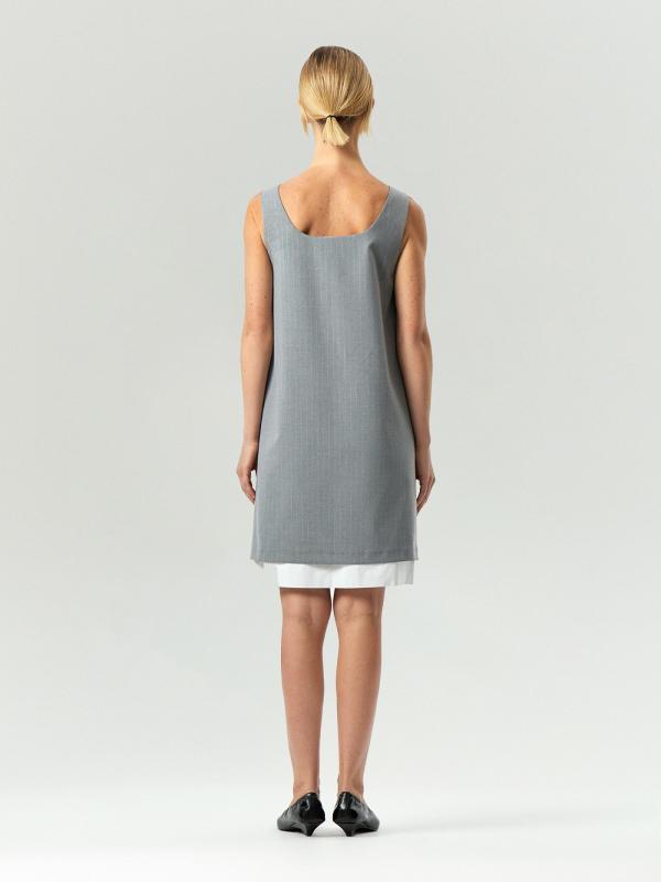 Офисно-повседневное платье с интересной изюминкой. Изюминку в образ вносит имитация удлинённой рубашки под жакетом или выпущенной подкладки. Это смотрится свежо и креативно. Белые хлопковые вставки также добавляют контрастности образу, а накладные клапаны напоминают о деловом стиле. Светло-серый цвет и тонкая светлая полоска идеально соответствуют офисному дресс-коду. Платье сделано из приятного на ощупь материала. Удобная модель без рукавов с квадратным вырезом может заменить в образе жилет, является отличным вариантом для многослойных стилизаций. Изделие выполнено на подкладке с дышащей вискозой.