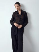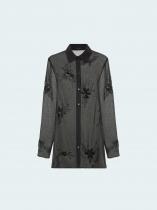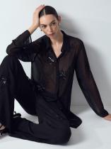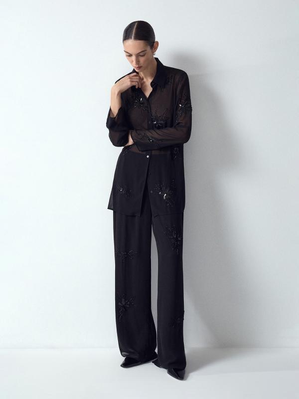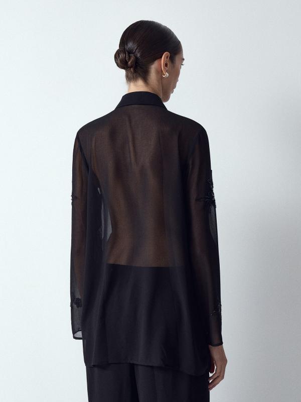 Невесомая прозрачная рубашка выполнена из тончайшего шифона, который украшен цветочным узором из стекляруса, пайеток и бисера. У рукавов нет манжетов и пуговиц: это делает фасон более неформальным. Шифоновая рубашка свободного кроя отлично подходит в качестве второго слоя. Может сочетаться с брюками и кимоно из комплекта, золотым или чёрным топом, другими вариантами первого слоя и низа. Такая вещь в гардеробе поможет открыть новые грани своего стиля и создать современный образ, в котором традиции сочетаются со свежими трендами сезона.