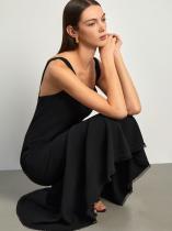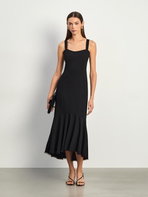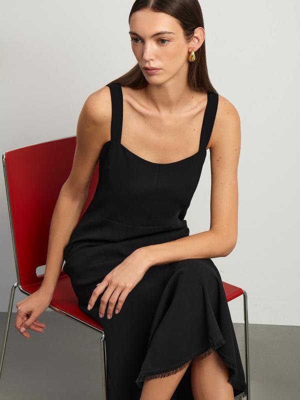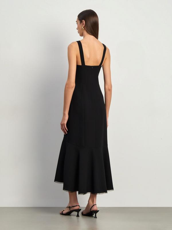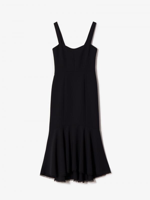 Элегантный выбор для коктейльного или вечернего образа. Модель выполнена на широких бретелях с округленным декольте и открытой спиной — это лаконичная классика. Юбка удлинена сзади и украшена широкой оборкой с бахромой по подолу — это добавляет в образ романтичности. Такую вещь можно надеть на свидание, на праздник и на работу под настроение. Благодаря строгому чёрному крепу она уместна и в будни. Платье сделано на подкладке. Застёгивается на спинке.