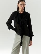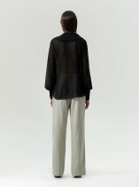 Полупрозрачная блуза из чёрного шифона соединяет в себе романтику и гранж. Асимметрично расположенные длинные воланы делают образ более драматичным, добавляют динамики. Блуза свободно садится, создаёт образ с чувством внутренней свободы. Воздушные рукава красиво драпируются в движении: этот динамичный объем переходит в сужение только у кистей. Рукава завершаются высокими манжетами. Вещь будет сочетаться с любым базовым низом. Отличное решение для коктейльных образов.