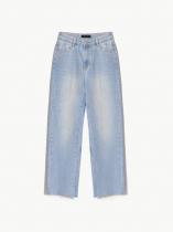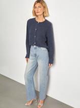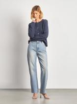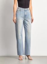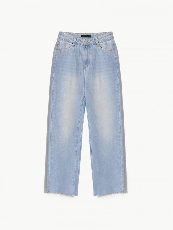 Джинсы в выбеленном голубом цвете с необработанным краем. Визуально вытягивают силуэт, делают его плавнее. Посадка мom fit удачно смотрится на разных типах фигуры. По длине модель особенно хорошо подходит на средний рост. Джинсы выполнены из качественного хлопка приятной фактуры.