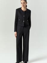Стильные чёрные брюки на каждый день и не только. Модель прямого кроя имеет сразу несколько интересных решений: она выполнена с потайными застёжками и без пояса, украшена защипами, имеет небольшой разрез сзади, узкие декоративные карманы с листочкой и вертикальные вытачки. Спереди вытачки устроены так, чтобы обеспечить улучшенную посадку по бёдрам и талии. Завершить образ можно жакетом из комплекта.