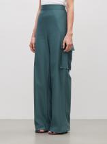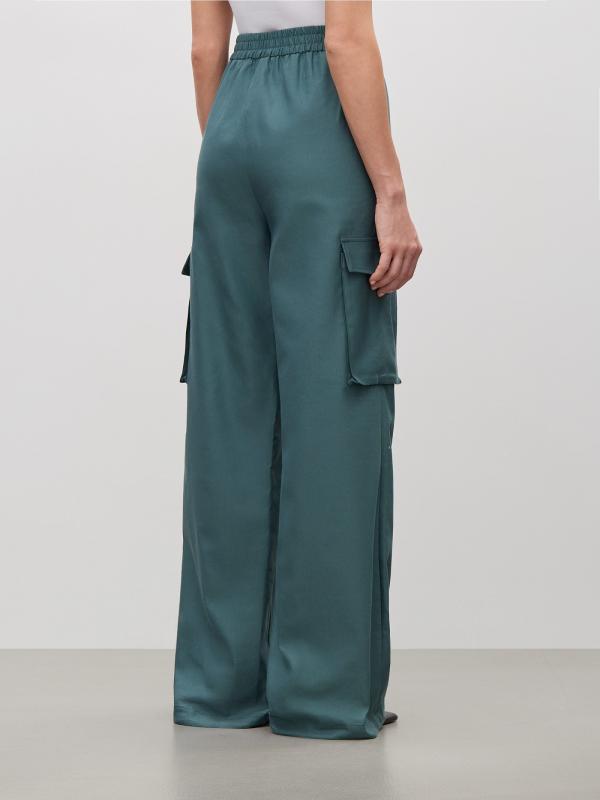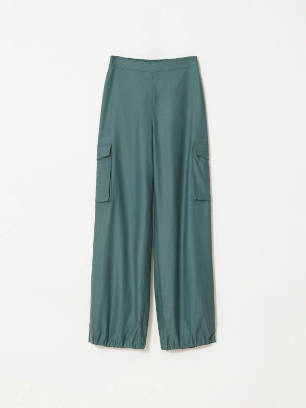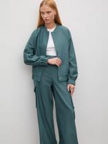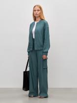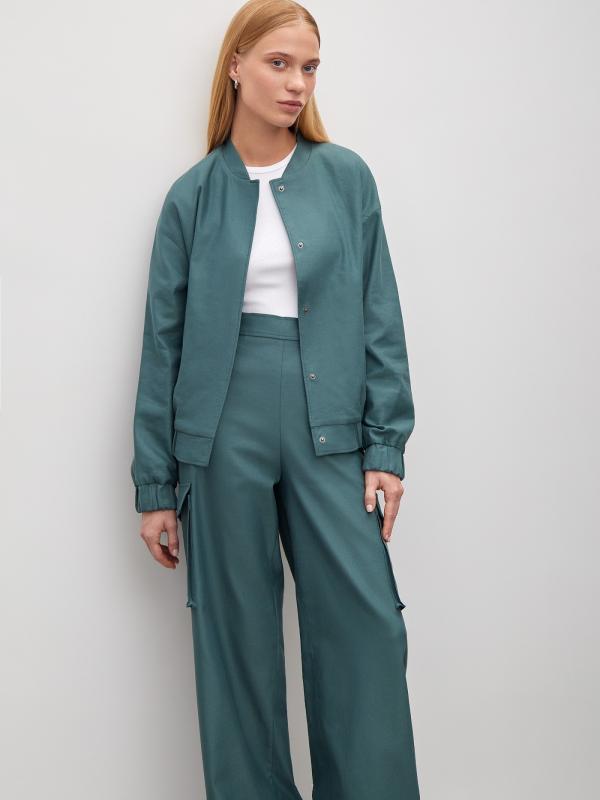 Брюки в модном оттенке зелёного изо льна и хлопка. Свободная модель карго с высокой посадкой и прямым кроем подойдёт на каждый день. Дополнить образ можно жакетом из комплекта и базовым трикотажем.