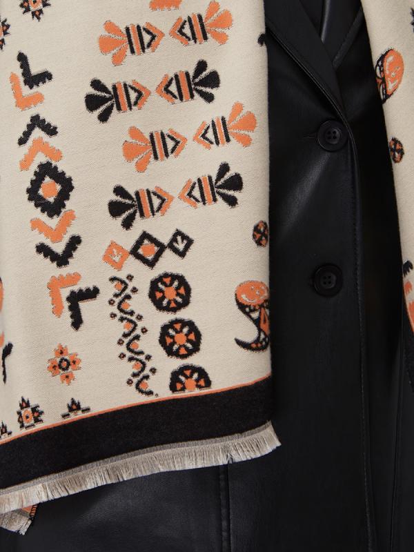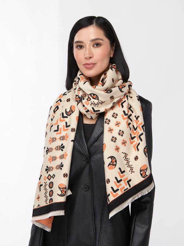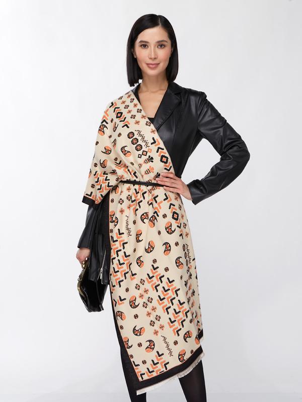 Представляем уникальный женский палантин от российского производителя TANTINO – идеальное дополнение для ассортимента вашего бутика или шоурума. Мы гордимся полным циклом собственного производства, от разработки эксклюзивных лекал до пошива, что гарантирует безупречное качество каждого изделия. Этот двусторонний палантин — воплощение стиля и комфорта. Он большой, мягкий и невероятно теплый, что делает его незаменимым аксессуаром для осенне-зимнего сезона. Особое внимание привлекает изысканный этнический узор в бежево-оранжево-черной гамме, который придает изделию уникальный, актуальный вид. Черная окантовка и деликатная бахрома по краям завершают образ, подчеркивая внимание к деталям. Преимущества для вашего бизнеса: Высокое качество: Собственное производство TANTINO обеспечивает строгий контроль на всех этапах, от выбора материалов до пошива. Актуальный дизайн: Этнический принт и двусторонний формат гарантируют высокий потребительский спрос. Универсальность: Легко комбинируется с различными стилями одежды,
