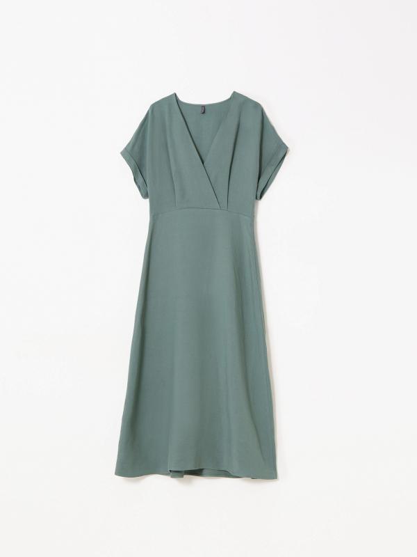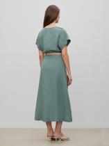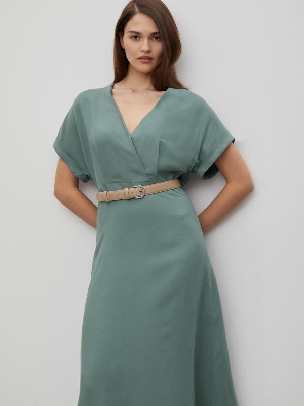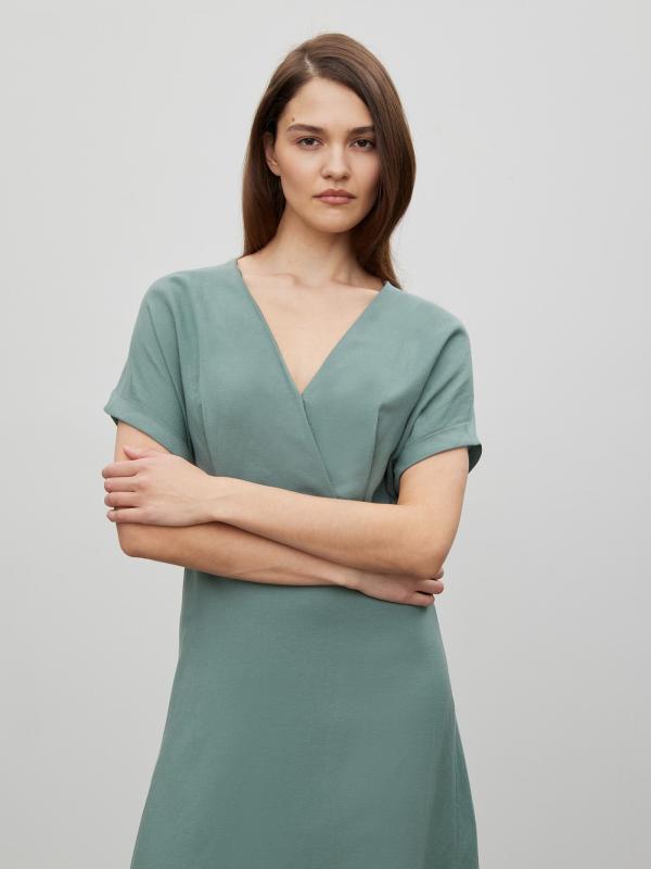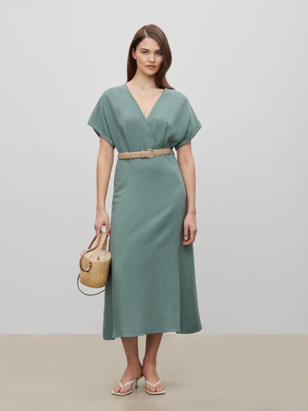 Платье в цвете хаки из вискозы и льна. Модель длины миди имеет короткий рукав и V-образный вырез. Верхняя часть с запахом дополнена удобной небольшой пуговицей. Изделие выполнено без подкладки.