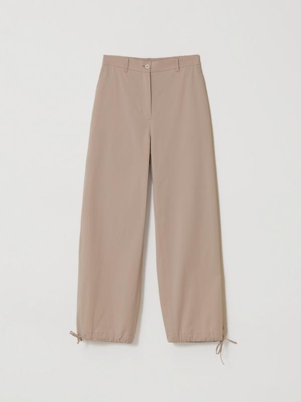 Бежевые брюки на каждый день. Выполнены из хлопка с небольшим добавлением эластана для большего комфорта. В нижней части брючин имеются кулиски с завязками, которые позволяют регулировать фасон, стилизуя брюки под настроение. Модель имеет резинку сзади для более комфортной посадки. Дополнена двумя фальш-карманами. Брюки изготовлены без подкладки.
