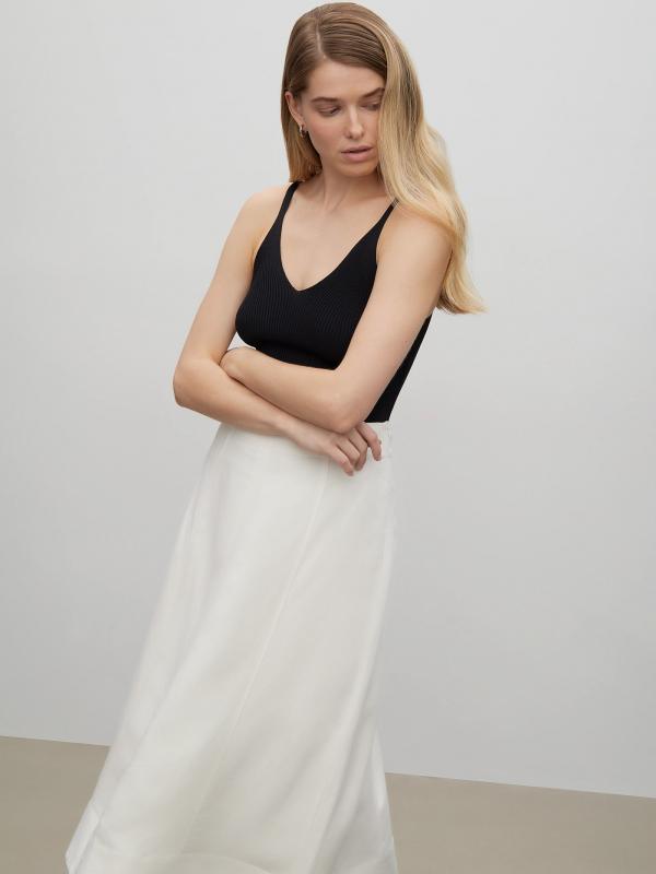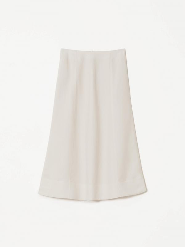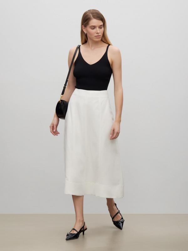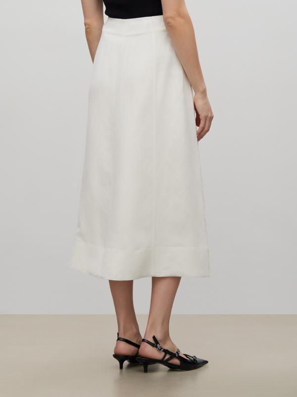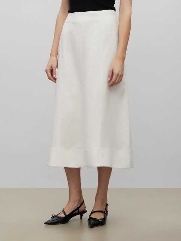 Юбка молочного цвета из вискозы и льна поможет создать женственный образ на любой случай. Модель длины миди имеет А-силуэт и высокую посадку. Застёгивается на молнию сбоку. Изготовлена на подкладке из вискозы.