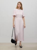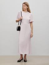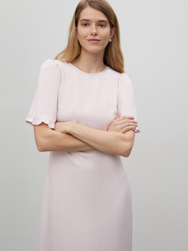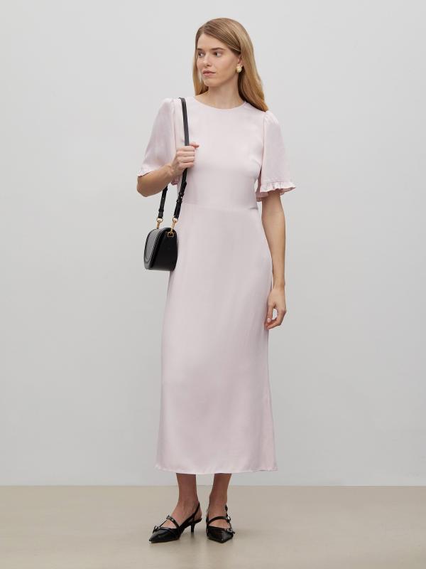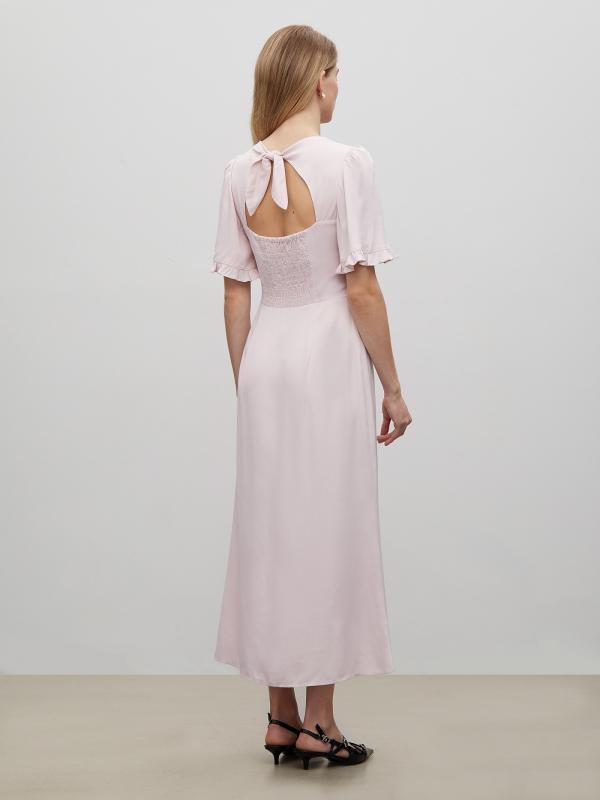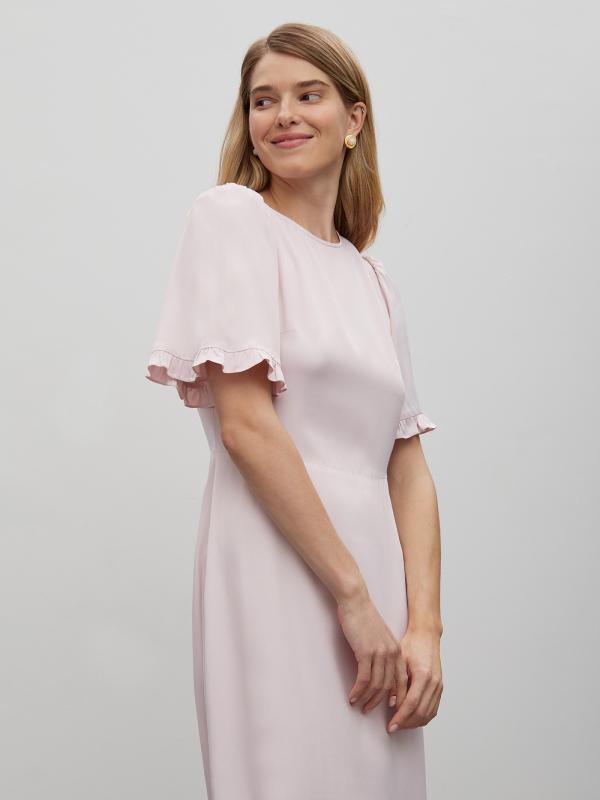 Женственный наряд к особому случаю и не только. Платье выполнено в светло-розовом цвете из гладкой вискозы с деликатным блеском. Приталенную модель в длине миди отличают отличают женственные рукава с аккуратными оборками и необычное оформление спинки. Сзади имеется завязка, под завязкой — фигурный вырез, а под вырезом — эластичная вставка со множеством мелких сборок. Платье застёгивается на молнию сбоку. Изготовлено без подкладки.