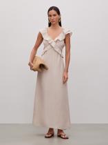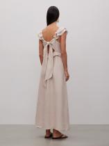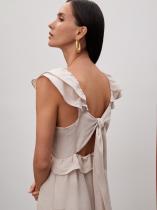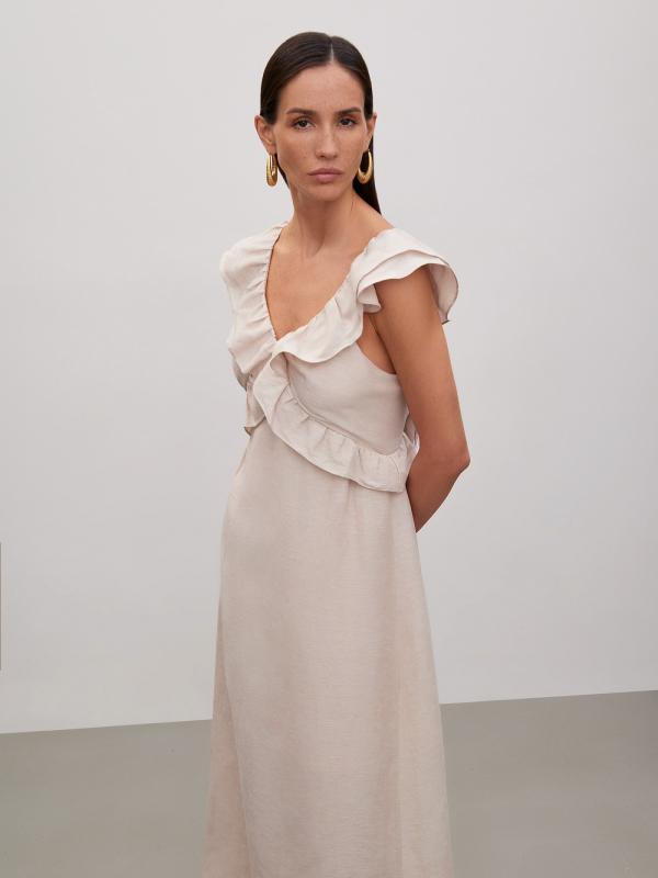 Нарядный сливочно-бежевый сарафан из хлопка и льна. Открытая спина, бант и воланы выглядят празднично. Платье будет очень кстати в отпуске. В нём особенно приятно посидеть в летнем кафе, прогуляться по набережной или устроить фотосессию. Изделие выполнено на комфортной к телу подкладке из дышащей вискозы.