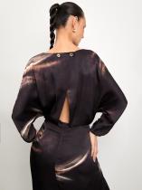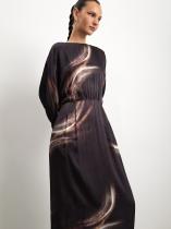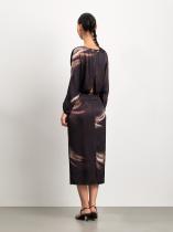 Шоколадно-коричневое платье с абстрактным принтом и трендовыми акцентами в крое. Сверху от отрезной талии расходятся сборки, а снизу — защипы. Низ рукавов также украшен сборкой. Спинка на запах с акцентными пуговицами дополнена небольшим треугольным вырезом и изящной кокеткой под ним. В нижней части платья расположена молния. На юбке предусмотрена глубокая шлица. Платье выполнено из тактильно приятной вискозы.
