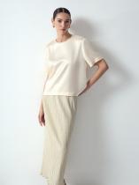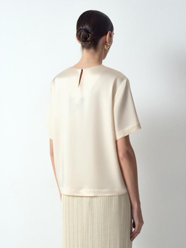 Обаятельная в своей лаконичности блузка подойдёт и к празднику, и на каждый день. Атлас нежного сливочного оттенка делает образ элегантным. Модель имеет круглый вырез и свободный короткий рукав. Застёгивается на крючки. На спинке под застёжкой располагается аккуратный вырез-капля. Дополнить образ можно любым базовым низом и стильным поясом.