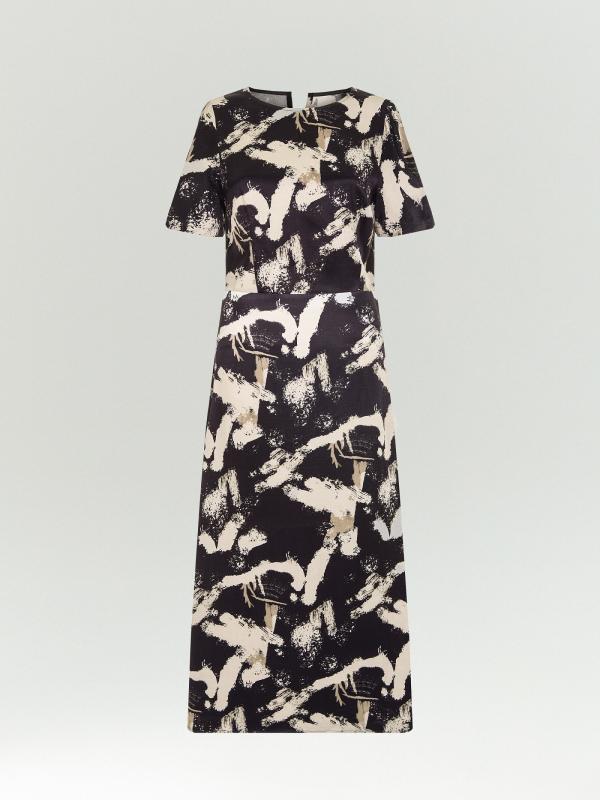 Универсальное платье с абстрактным принтом: крупные мазки в цвете полыни на чёрном фоне оживят повседневные образы. Модель A-силуэта с отрезной талией удачно садится на разные фигуры. Подходит под базовые чёрные жакеты. Изготовлено из приятной к телу вискозы, без подкладки. Застёгивается на молнию.