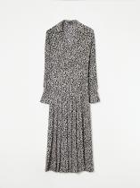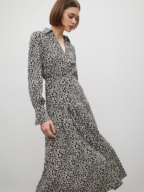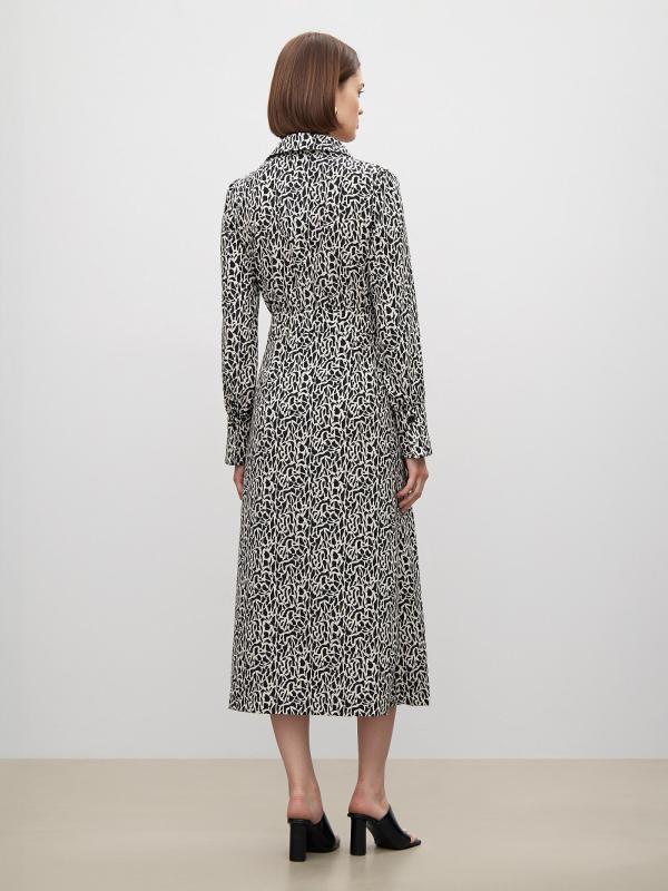 Платье с абстрактным принтом и акцентом на талии. Нежный пояс, подчёркивающий женственность, интеллектуальный и в то же время милый принт создадут очаровательный образ на каждый день. Модель длины миди имеет V-образный вырез, аккуратный отложной воротник и манжеты на рукавах с золотисто-чёрными пуговицами. На юбке имеется разрез для свободы шага. Изделие выполнено из лёгкого материала с содержанием вискозы, без подкладки.
