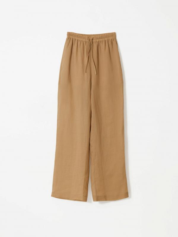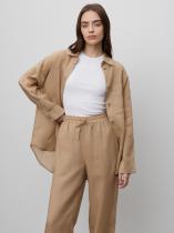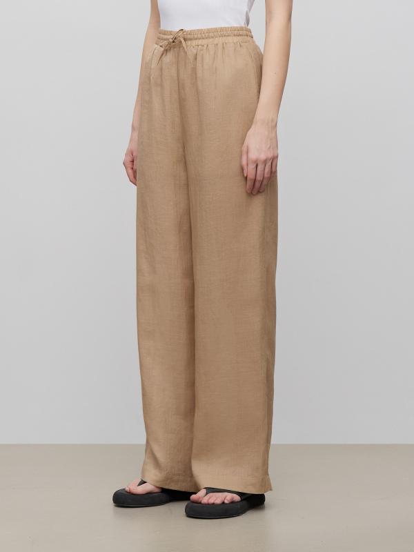 Приятные к телу брюки из рами станут отличным выбором на каждый день. Натуральный материал на основе крапивы даёт легкость, защищает от перегрева, не электризуется и устойчив к износу. Бежевый цвет универсален и стильно смотрится. Модель высокой посадки выполнена на широкой резинке с завязками: очень удобно и позволяет по-разному сажать брюки по фигуре.