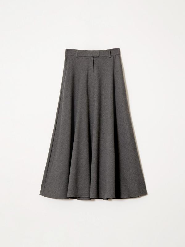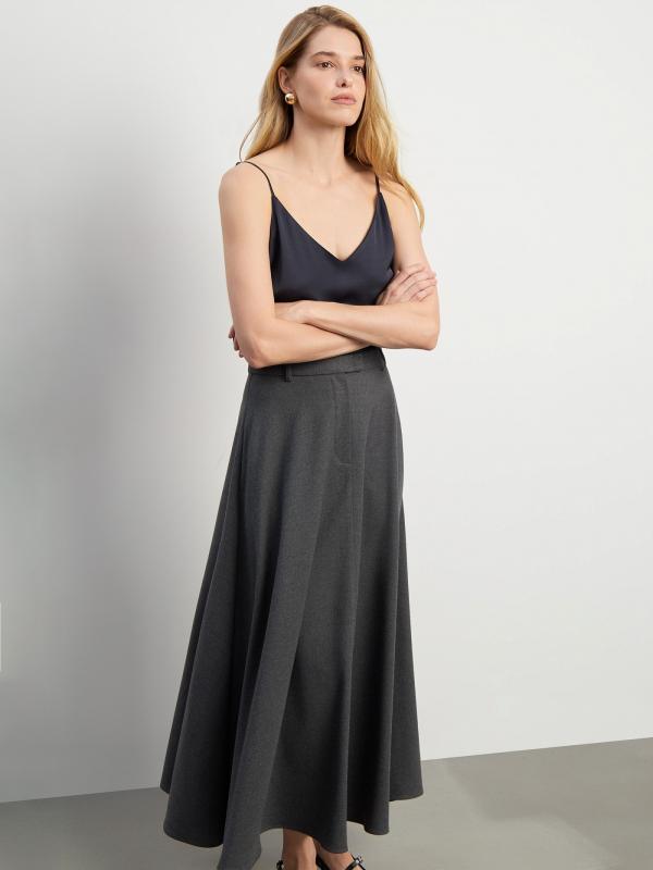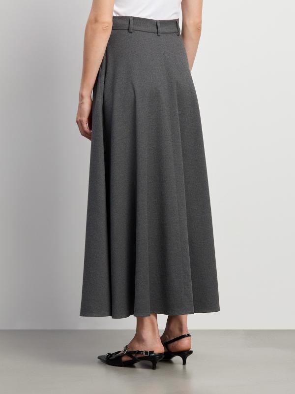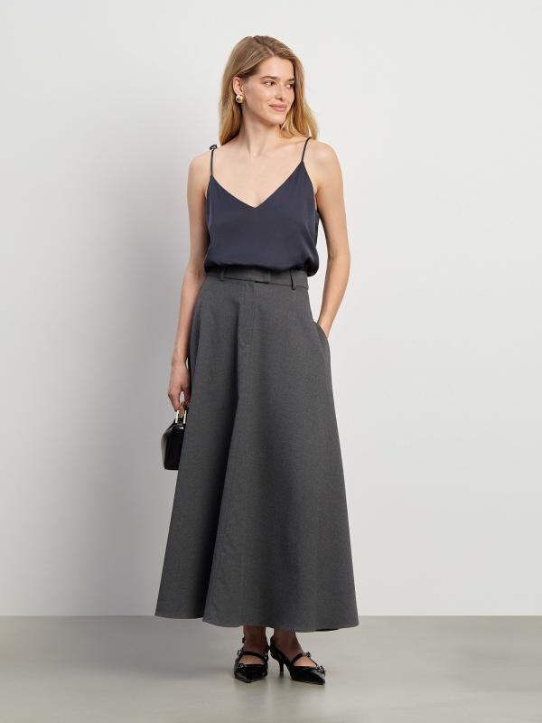 Юбка в сером цвете. Модель А-силуэта имеет длину миди и высокую посадку. Дополнена прорезными карманами и шлёвками для ремня. Выполнена из материала с высоким содержанием вискозы.