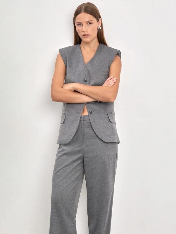 Элегантные брюки для офисных образов. Выполнены из мягкого материала с шерстью, в располагающем светло-сером оттенке. Модель прямого кроя имеет высокую посадку и полную длину. Дополнена потайной застёжкой. Завершить образ можно жилетом из комплекта, сатиновыми или атласными блузами и топами, тонким трикотажем.