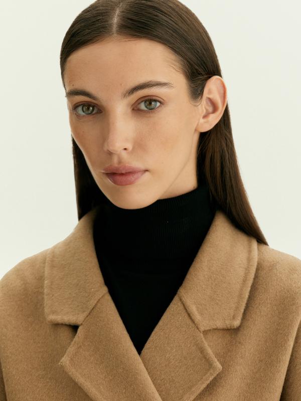 Элегантное манто в бежевом цвете смотрится современно и необычно. По бокам имеются разрезы. Предусмотрены специальные прорези для пояса. Материал более чем на 2-3 состоит из натуральной шерсти высокого качества и выполнен по технологии double-face: благодаря этому он дорого выглядит и отлично держит форму. Соединяли детали и прошивали пальто вручную: премиальное исполнение подтверждает вшивной ярлык hand made на рукаве. Пальто рассчитано на температуры до +5°C. Сделано без подкладки.