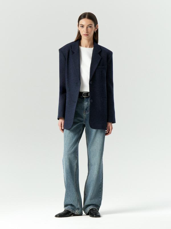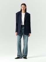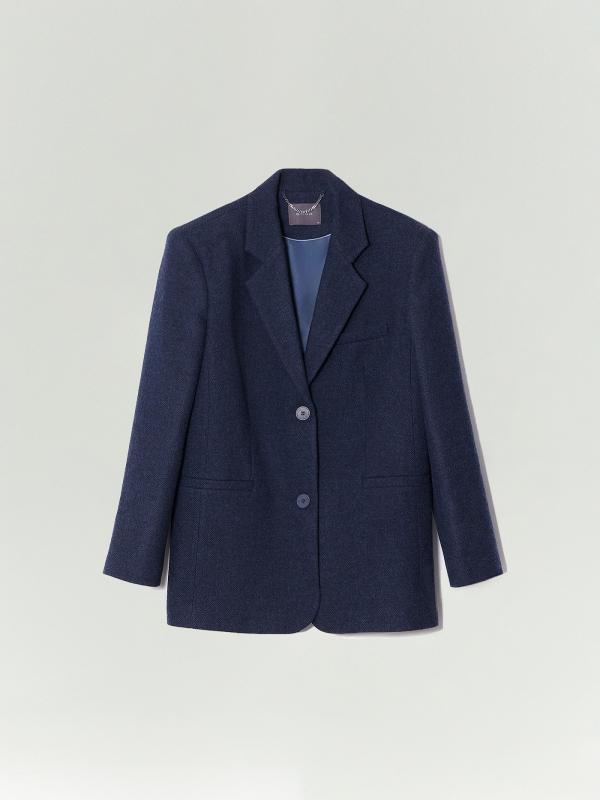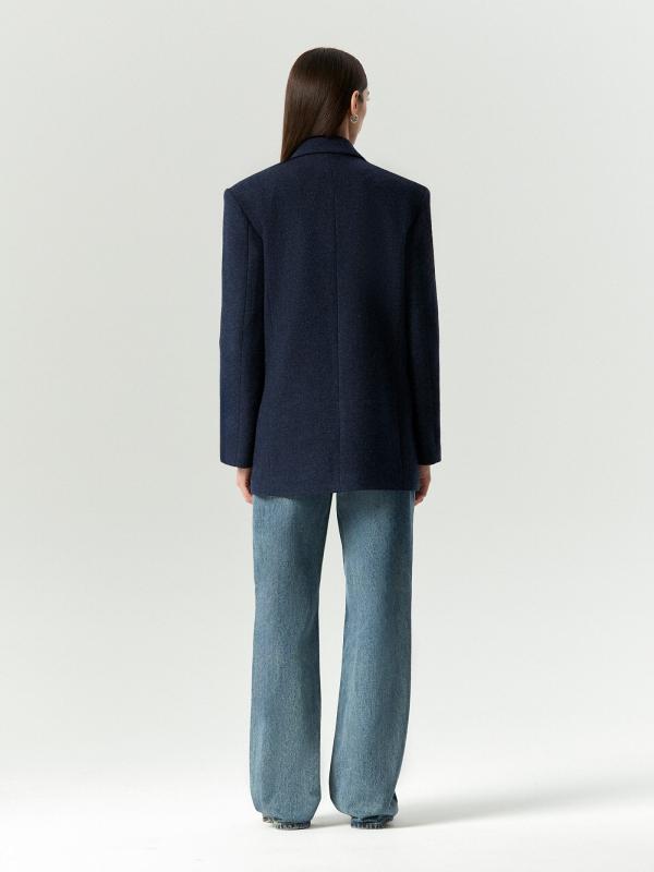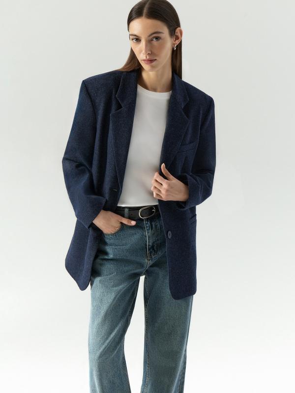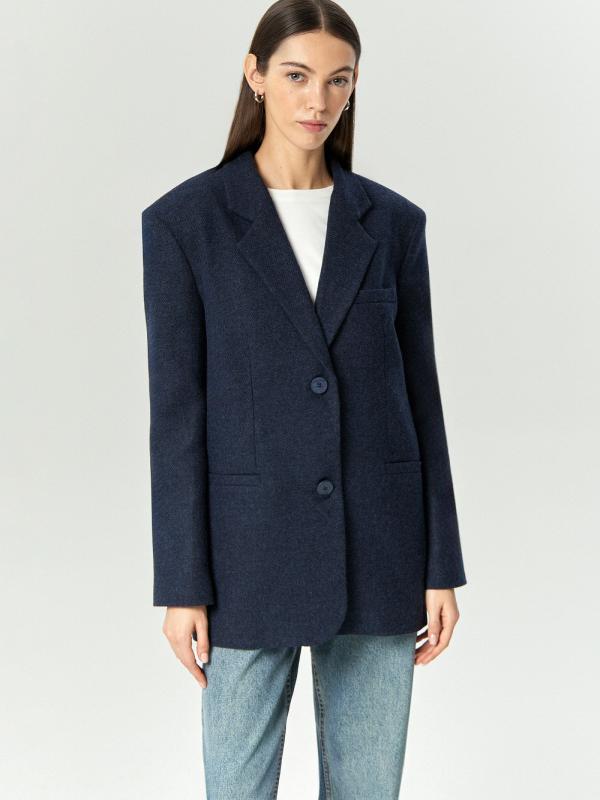 Пальто-жакет в тёмно-синем цвете станет базой демисезонных образов. Подойдёт в качестве верхнего слоя на начало осени или середину весны. Плотный материал более чем на 2-3 состоит из натуральной шерсти. Изделие выполнено на подкладке с высоким содержанием дышащей вискозы. Однобортная модель с английским воротником выражает тренд на сочетание фасонов классических офисных костюмов и пальтовых тканей.