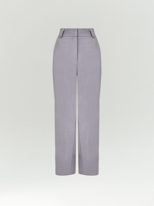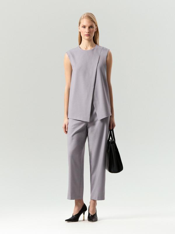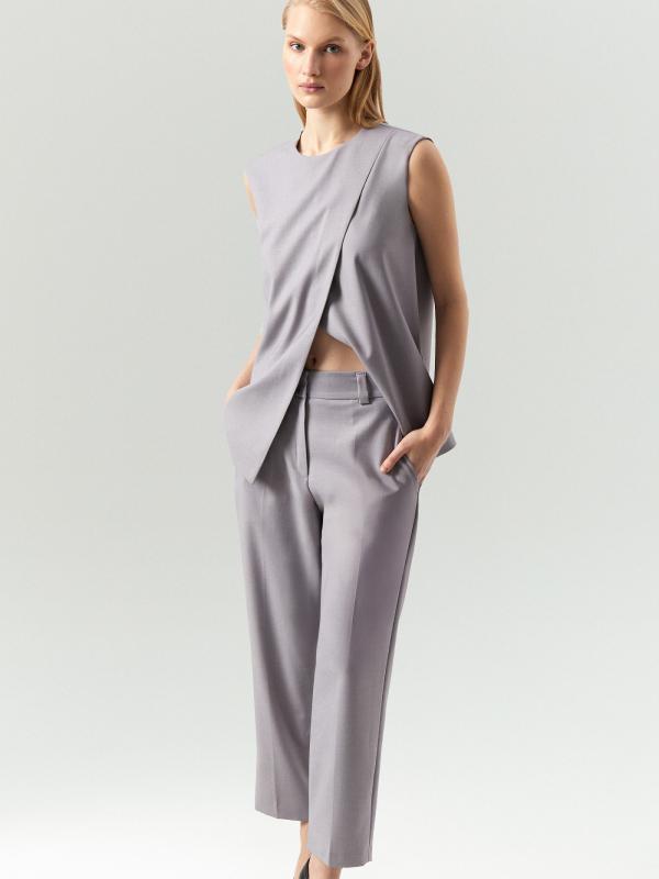 Брюки отличаются изысканным оттенком: серый с лиловым подтоном выглядит необычно. По-весеннему лёгкая костюмная ткань с содержанием вискозы комфортно ощущается на теле. Такая вещь хороша для нарядных, деловых и даже повседневных образов. Элегантная модель с потайной застёжкой имеет высокую посадку и зауженный крой. Дополнить можно жилетом из комплекта. Брюки могут стать частью капсулы с жилетом и юбкой piter.