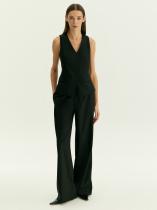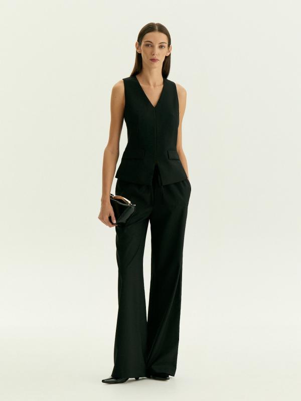 Чёрные брюки для стильных и современных образов на каждый день. Модель средней посадки выполнена с завязкой спереди. Тонкий, но тёплый костюмный материал на четверть состоит из шерсти, выполнен с содержанием вискозы и добавлением эластана. Это идеальный вариант на демисезон и не только. Завершить образ с брюками можно жилетом из комплекта.