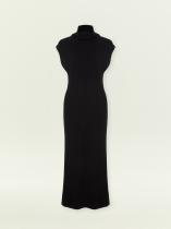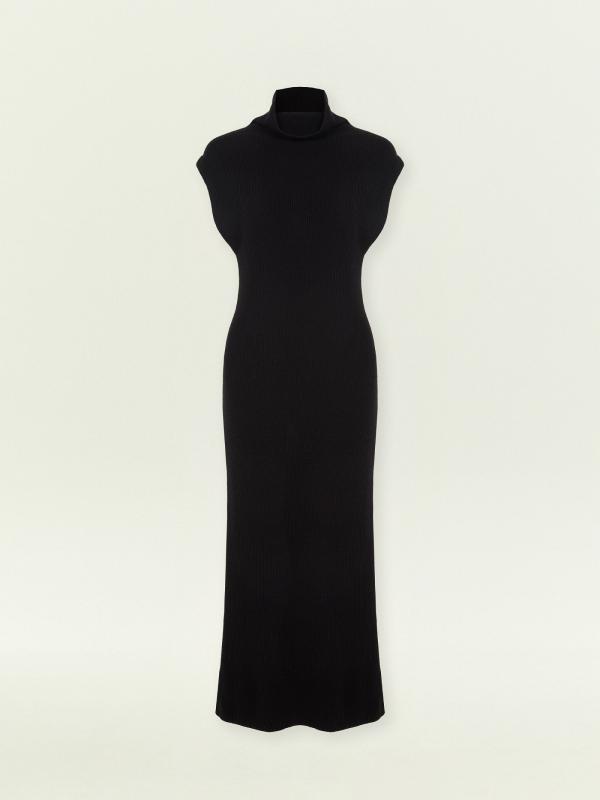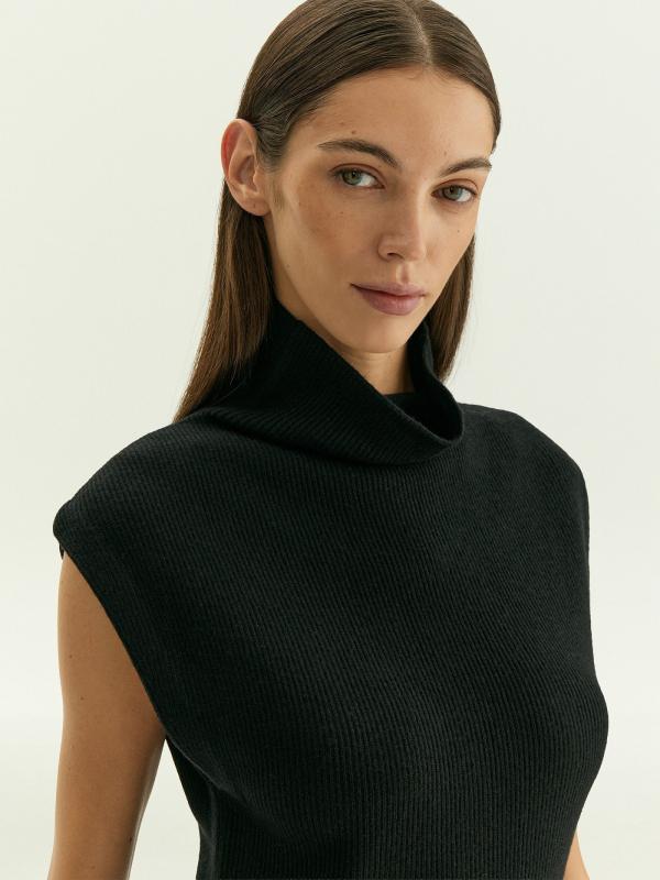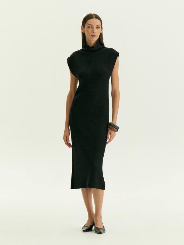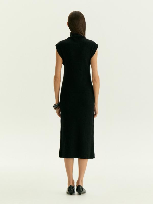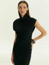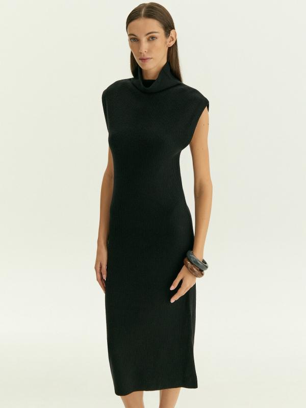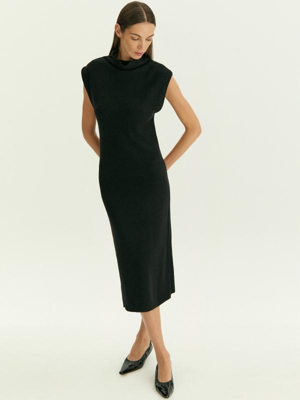 Тёплое базовое платье наполовину состоит из шерсти: отличный вариант на каждый день. Модель имеет актуальный фасон: без рукавов и со спущенным плечом, дополнена высокой горловиной-хомутом. Лаконичный дизайн, чёрный цвет и длина миди делают платье универсальным. Такая вещь позволяет экспериментировать с яркими аксессуарами, создавая стильные образы на любой случай.
