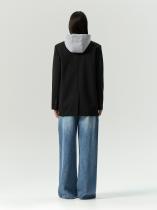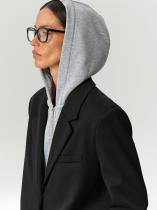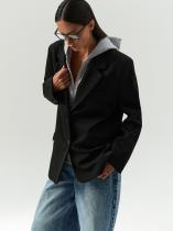 Жакет с имитацией худи отражает модную игру с деконструированными формами и создаёт эффект многослойности. Это креативный и комфортный вариант верхнего слоя на смену пальто и курткам. Можно застилизовать с простой белой рубашкой и леггинсами, можно носить с базовым денимом и костюмными брюками. Жакет может стать частью капсулы с комплектом emma из предыдущих коллекций.