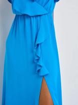 Верх выполнен в виде запаха с оборками по линии декольте, которые переходя на линию разреза по юбке.