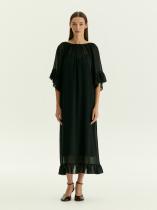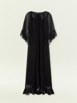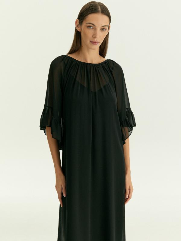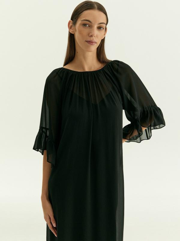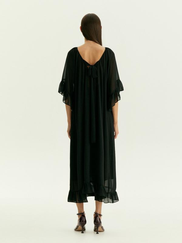 Летящее полупрозрачное платье из чёрного шифона подойдёт для особых случаев и под настроение. Образ с А-силуэтом, обнажённной спиной, открытыми руками, мягко спадающими на плечи оборками подчеркнёт хрупкость или мягкость в зависимости от особенностей телосложения. Глубокий вырез на спинке дополнен бантом. Платье идёт в комплекте с приятной к телу комбинацией из вискозы.