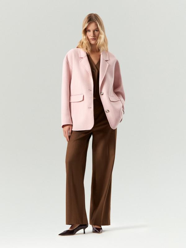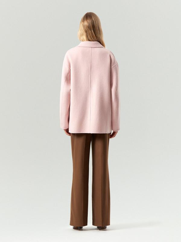 Укороченное пальто-жакет в одном из главных цветов сезона — розовом. Материал более чем на 2-3 состоит из натуральной шерсти высокого качества и выполнен по технологии double-face: благодаря этому он дорого выглядит и отлично держит форму. Соединяли детали и прошивали пальто вручную: премиальное исполнение подтверждает вшивной ярлык hand made на рукаве. Пальто рассчитано на температуры до +5°C. Актуальная модель прямого кроя имеет английский воротник и карманы с клапанами.