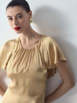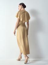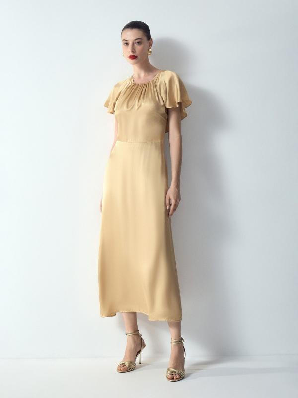 Золотистое платье создаст волшебное настроение к любому празднику. Фасон с рукавами-крыльями, переходящими в пелерину на спинке, смотрится невероятно женственно. Эффектная драпировка спереди и элегантный узел сзади добавляют в образ изюминку, отражая ключевые тренды сезона. В области талии сзади имеется эластичная вставка. Изделие выполнено из нарядной плательной вискозы, на комфортной вискозной подкладке.