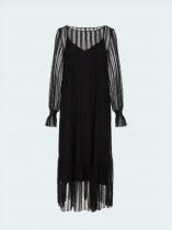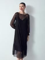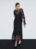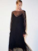 Платье покажет оригинальную натуру и утончённый вкус. Ряды восхитительных кружевных рюшей на прозрачной сетке говорят сами за себя. Самодостаточный чёрный цвет и лаконичный А-силуэт — самая удачная канва для такого яркого стилистического заявления. Прозрачное платье дополнено чёрной комбинацией из приятной к телу вискозы.