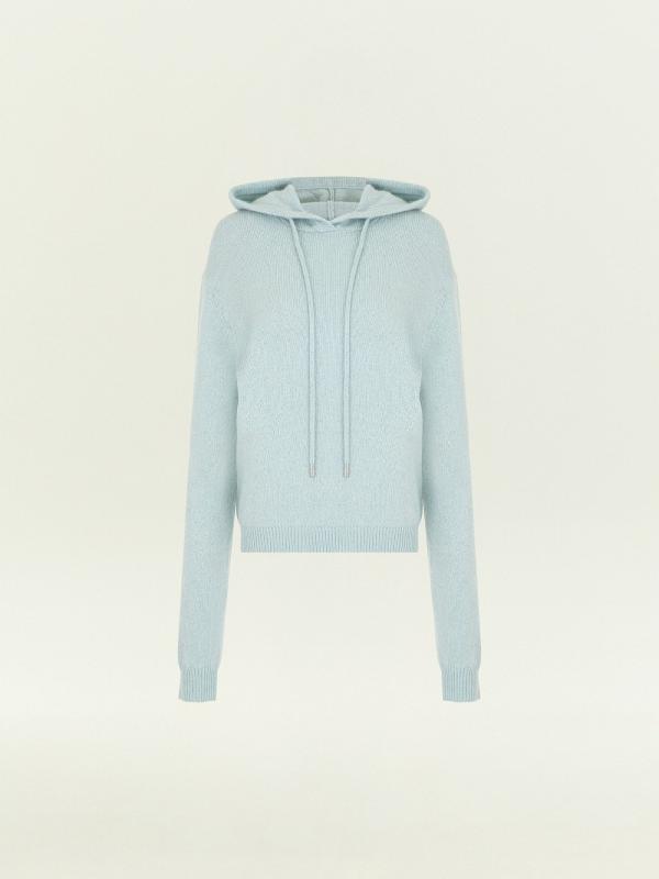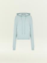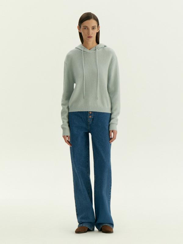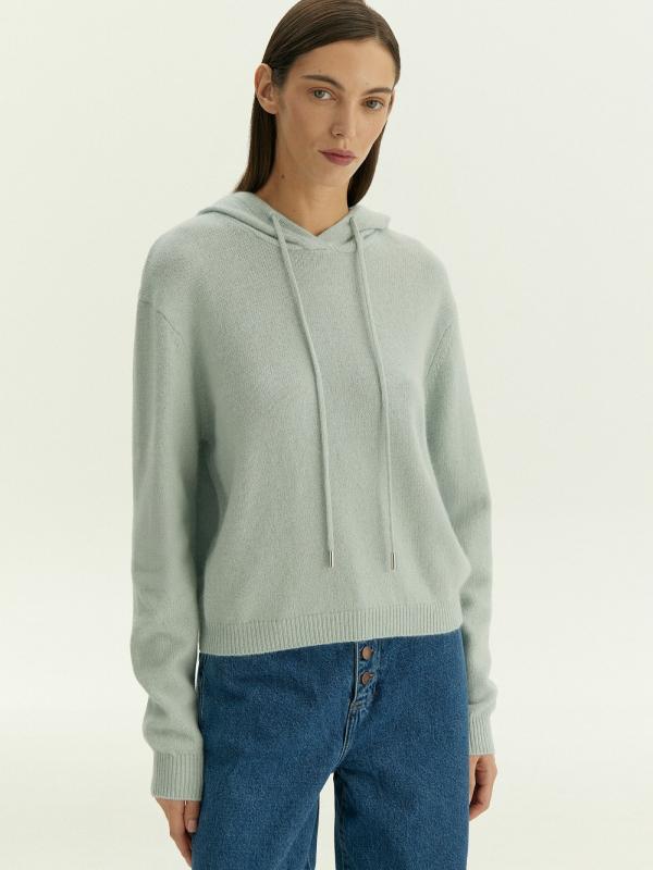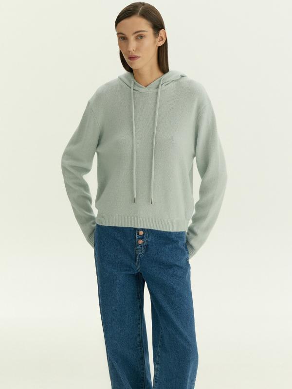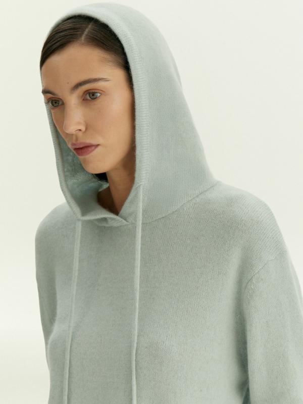 Худи в светлом серо-голубом оттенке для уютных образов на каждый день. Тонкий, но тёплый материал более чем на 2\3 состоит из натуральной шерсти. Не колется, приятно ощущается на теле. Капюшон дополнен длинными шнурками.