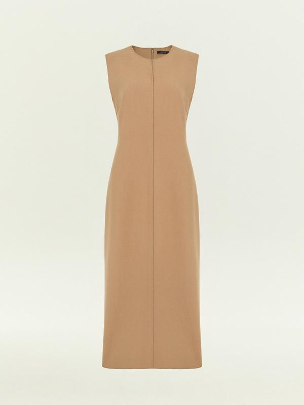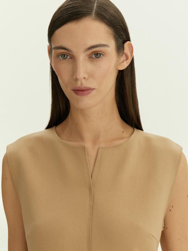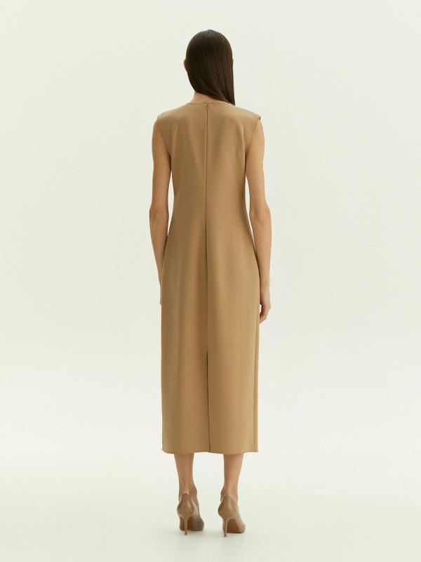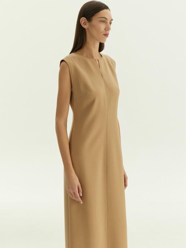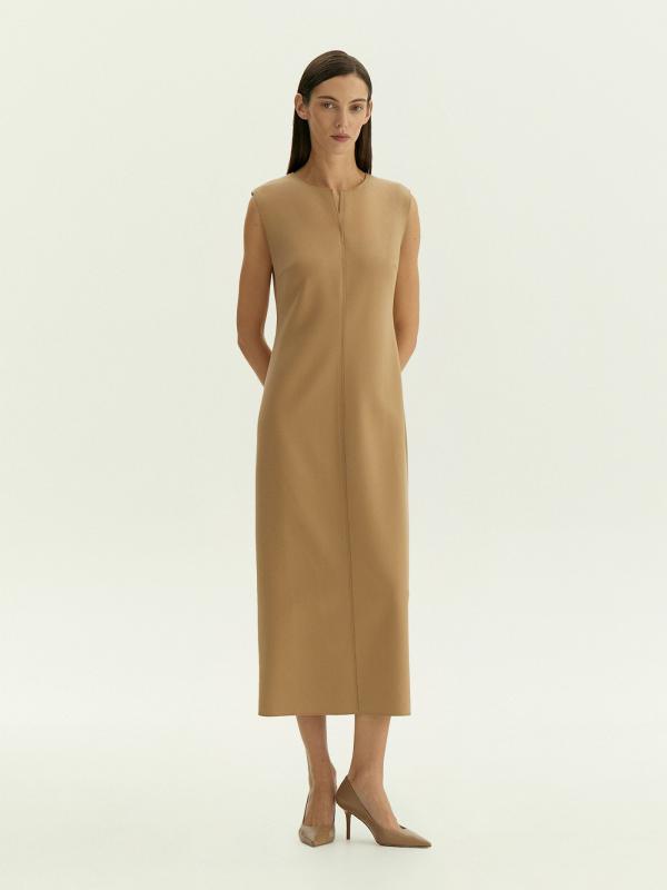 Платье-футляр из очень мягкого, приятного на ощупь трикотажа в телесно-бежевом цвете станет отличным вариантом на каждый день. Приталенную модель без рукавов отличает акцентный шов. Модель выполнена в длине мидакси, которая не теряет актуальности и подходит к любому случаю. Платье может стать частью капсулы с топом tucomo в том же стиле.