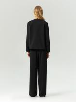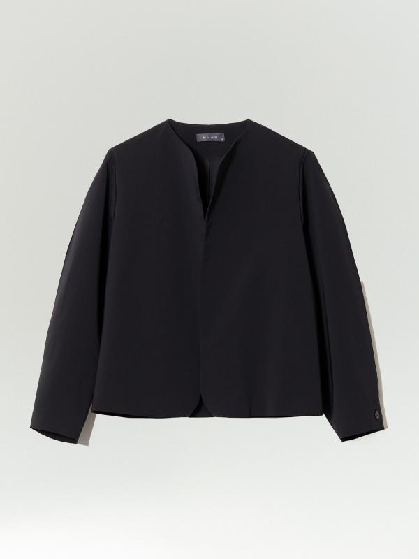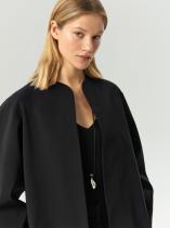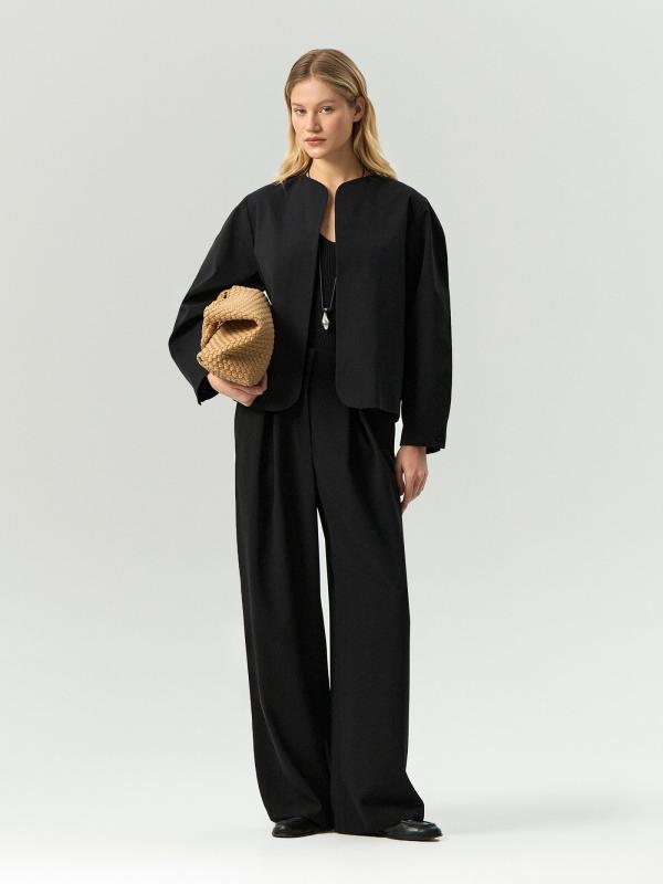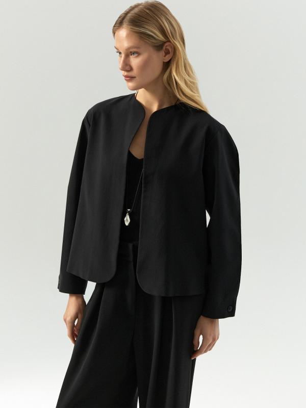 Оригинальный чёрный жакет без лацканов и застёжек с объемным рукавом. Рукав выполнен с отстрочкой, имеет шлицу с пуговицей: его можно красиво подвернуть. Жакет сделан из приятной на ощупь ткани с интересной фактурой, которая немного напоминает плащевую. В составе большая доля вискозы, имеется подкладка. Вещь станет интересным дополнением образов на каждый день и стилизаций к особым случаям.