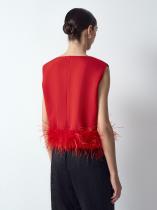 Коктейльный топ в красном цвете с двойным рядом перьев по низу. Укороченная прямая модель с круглым вырезом отлично подойдёт к брюкам или юбкам с завышенной посадкой. С топом можно собирать запоминающиеся монохромные образы или сделать его единственным акцентом образа. Изделие выполнено на подкладке. Перьевой декор не отстёгивается.