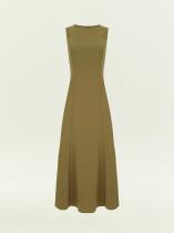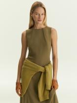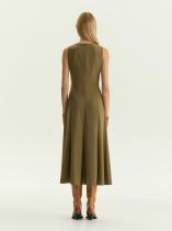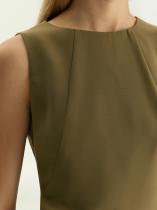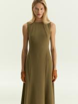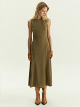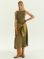 Платье мидакси без рукавов подойдёт на каждый день и к особым случаям. Отличный вариант для образов с тонкими лонгсливами из сетки или жакетами. Рельефы визуально сужают области бёдер и плеч, а в нижней части платья также создают более динамичную конструкцию платья, которая эффектно раскрывается в движении. Цвет оливки — среди ключевых в новом сезоне